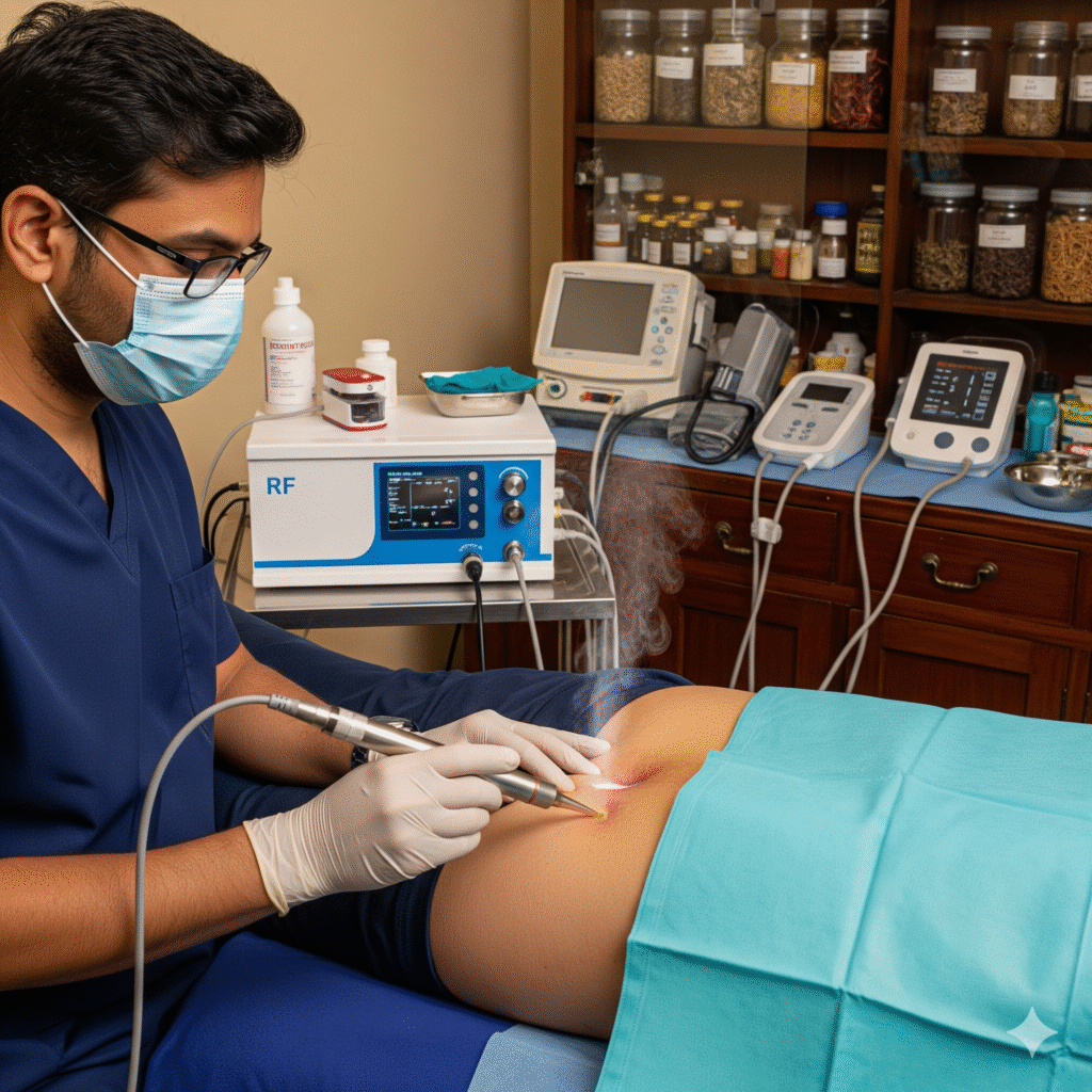 Radio Frequency Cauterization (RFC) is a minimally invasive piles treatment where high-frequency radio waves are used to coagulate and shrink the hemorrhoidal tissue. It is particularly useful for patients with Grade II, Grade III, and selected Grade IV hemorrhoids, ensuring less tissue damage and reduced post-operative discomfort.